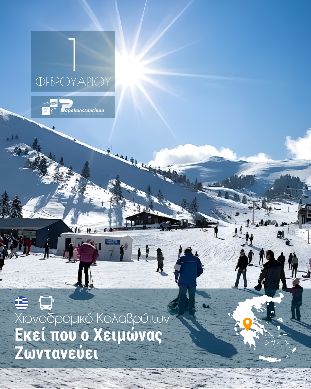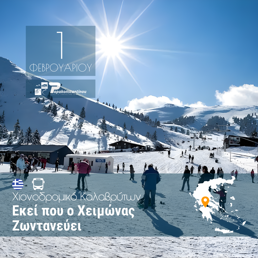 Ξεκινάμε νωρίς το πρωί από την Πάτρα με προορισμό τον πιο αγαπημένο χειμωνιάτικο προορισμό της Αχαΐας: τα Καλάβρυτα! Η διαδρομή μέσα από τα έλατα και τις πλαγιές του Χελμού μάς βάζει αμέσως στο κλίμα της εκδρομής. Πρώτος μας σταθμός το Χιονοδρομικό Κέντρο Καλαβρύτων, εκεί όπου το χιόνι απλώνεται σαν λευκό χαλί και η ατμόσφαιρα μυρίζει χειμώνα και… περιπέτεια. Έχουμε ελεύθερο χρόνο για να απολαύσουμε έναν ζεστό καφέ στο σαλέ με θέα τις πλαγιές, να κάνουμε βόλτα στο χιονισμένο τοπίο ή να γεμίσουμε το άλμπουμ μας με φωτογραφίες που μοιάζουν βγαλμένες από καρτ ποστάλ. Οι λάτρεις της δράσης μπορούν να επιλέξουν (προαιρετικά) δραστηριότητες του χιονοδρομικού, ενώ οι πιο χαλαροί μπορούν απλώς να απολαύσουν την ηρεμία του βουνού και το μαγευτικό τοπίο.