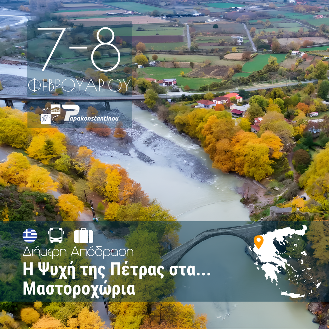 Το πρωί μετα το πρωινο μας, φεύγουμε για εξόρμηση στα ξακουστά Μαστοροχώρια, μια ομάδα ορεινών οικισμών που απλώνονται μέχρι τις παρυφές του Γράμμου, στα ελληνοαλβανικά σύνορα. Πρώτη στάση η Πυρσόγιαννη, έδρα του Δήμου των Μαστοροχωρίων και πατρίδα της πλειοψηφίας των μαστόρων της Ηπείρου, χτισμένη αμφιθεατρικά σε πλαγιά του Γράμμου και αποτελεί ένα πραγματικό κομψοτέχνημα. Το χωριό στολίζουν η λιθόστρωτη πλατεία, η εκκλησία του Αγίου Νικολάου (1772), αλλά και η εκκλησία του Αγίου Γεωργίου (1904). Συνεχίζουμε για το χωριό Θεοτόκος, ένας πανέμορφος οικισμός με ελάχιστους κατοίκους, σε υψόμετρο 700 μέτρων. Ακολουθει το Κεφαλοχώρι, ένα καινούργιο σχετικά χωριό που δημιουργήθηκε το 1969.Αναχωρούμε για το Γεφύρι Ζέρμας, το μοναδικό σωζόμενο πέτρινο γεφύρι στον Σαραντάπορο, χτισμένο το 1747 που αποτελεί σήμα κατατεθέν της περιοχής. Τελευταίο χωριό που θα επισκεφτούμε είναι η Δροσοπηγή, με τα επιβλητικά αρχοντικά και τις ολάνθιστες αυλές, ένα από τα καλύτερα διατηρημένα Μαστοροχώρια, όπου θα πάρουμε το γεύμα μας. Με την ολοκλήρωση της περιήγησής μας παίρνουμε τον δρόμο για τον γυρισμό της επιστροφής στην Πάτρα.