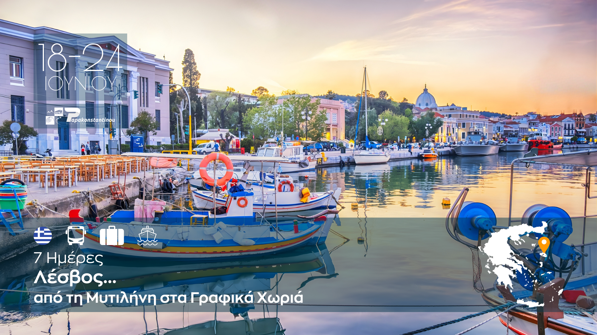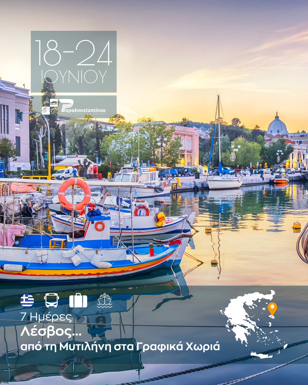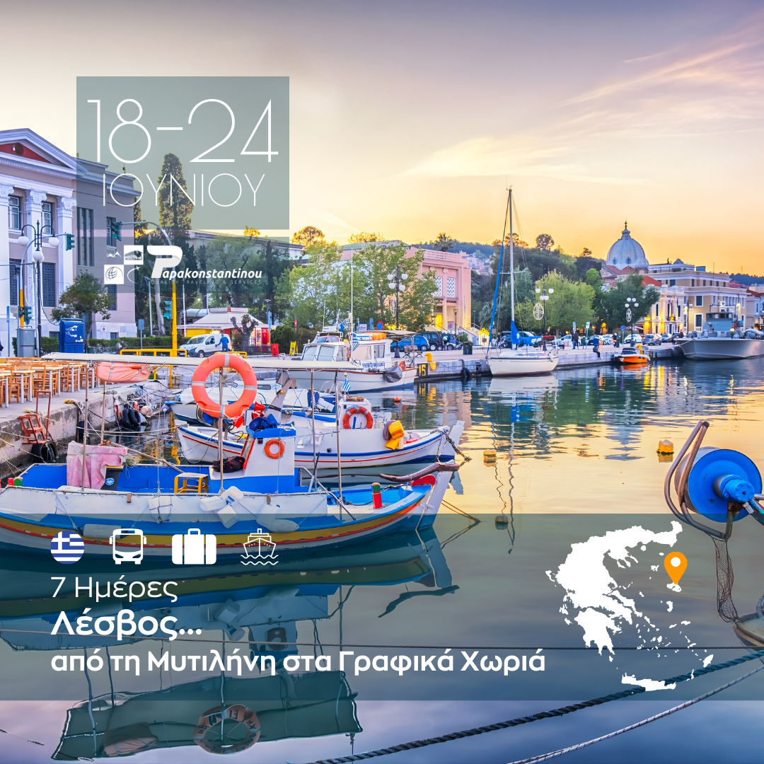 Ανακαλύψτε τη μαγευτική Λέσβο σε ένα ολοκληρωμένο επταήμερο ταξίδι γεμάτο εικόνες, γεύσεις και αυθεντικές εμπειρίες. Από τη ζωντανή Μυτιλήνη και τα γραφικά σοκάκια του Μολύβου μέχρι την ατμοσφαιρική Αγιάσο και το παραδοσιακό Πλωμάρι, η εκδρομή συνδυάζει πολιτισμό, φύση και χαλάρωση με τον πιο ιδανικό τρόπο.