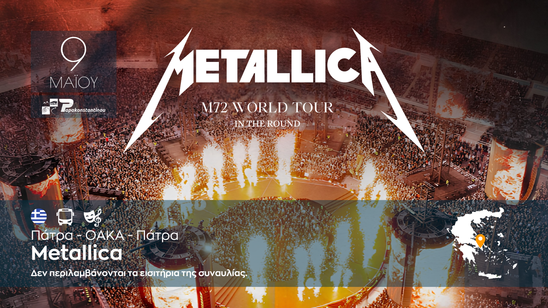 Οι Metallica έρχονται στο ΟΑΚΑ (Ολυμπιακό Στάδιο) της Αθήνας στις 9 Μαΐου 2026, στο πλαίσιο της M72 World Tour, φέρνοντας την εντυπωσιακή 360° σκηνή “in-the-round”. Η συναυλία αναμένεται να είναι ένα από τα μεγαλύτερα γεγονότα του 2026, με τους Gojira και Knocked Loose ως special guests.